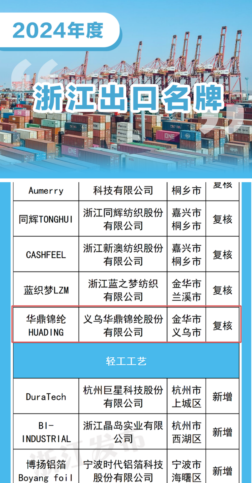 近日,浙江省商务厅印发通知,将2024年度461个“浙江出口名牌”予以公布,其中新增173个、复核288个,有效期为三年(2025年至2027年)。华鼎股份的出口品牌“华鼎锦纶Huading”在有效期内通过复核,入选2024年度“浙江出口名牌”榜单。
