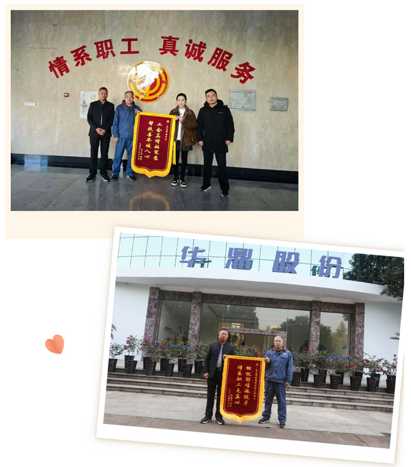近日,暖心感人的一幕分别发生在义乌市总工会、华鼎北苑厂区,华鼎员工杨风光拿着书写着“工会真情驱寒意,帮扶善举暖人心”、“排忧解难施援手,情系职工见真心”的锦旗,分别送到义乌市总工会党组成员、财贸工会主席马琳,以及华鼎工会主席张新夫手上,对工会组织开展的精准帮护措施和送温暖行动,表达一份朴质的感恩、感谢之情。
